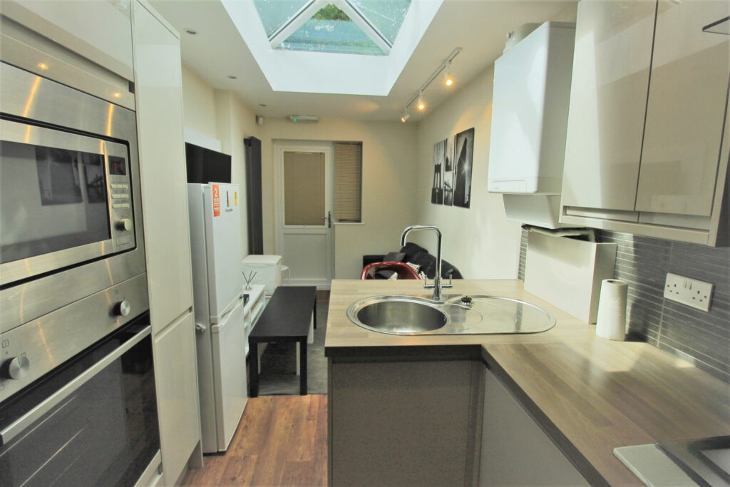 On the ground floor meanwhile, students will also find a modern kitchen and shared open-plan lounge, combining both comfort and convenience for tenants. The lounge provides a cosy space for students to relax and features a communal wall-mounted television and a faux-leather sofa. The adjoined kitchen meanwhile has been fitted with a sleek wood-effect breakfast bar and work-tops, high-gloss cabinets, and a range of integrated cooking appliances.