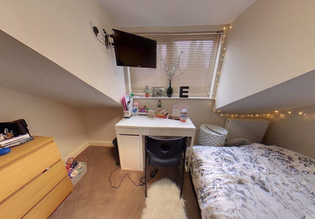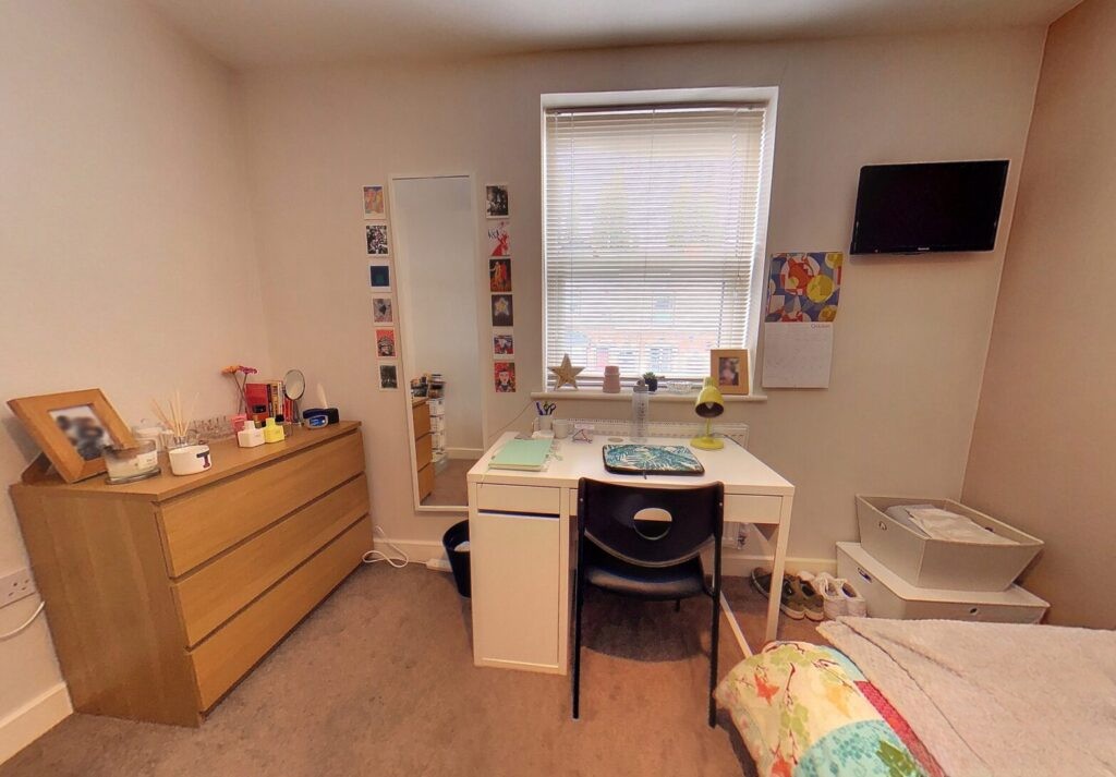Each of the six bedrooms then showcases a well-proportioned and comfortable layout. Inside each, students will find a personal television, a double bed, a built-in wardrobe, a desk, and a drawer set.