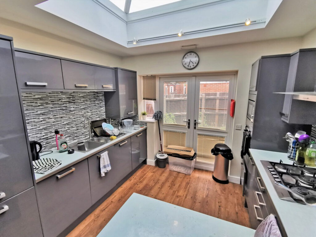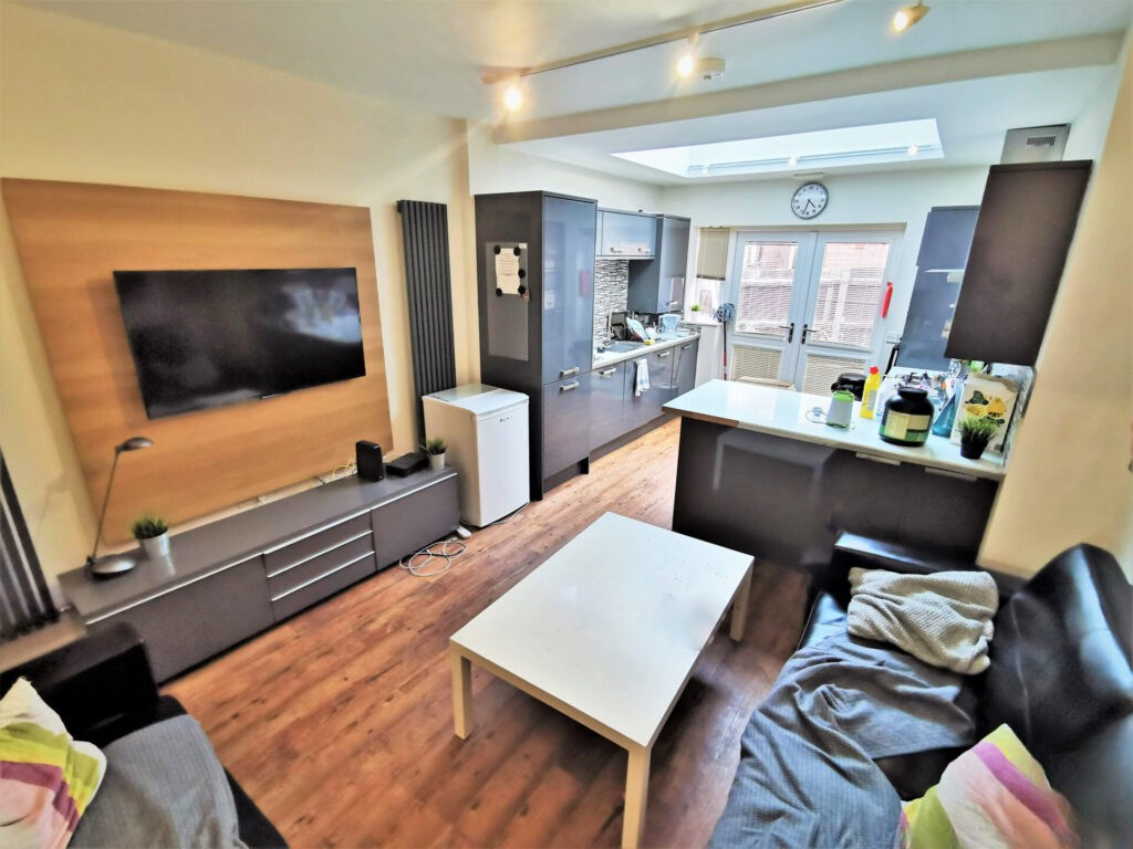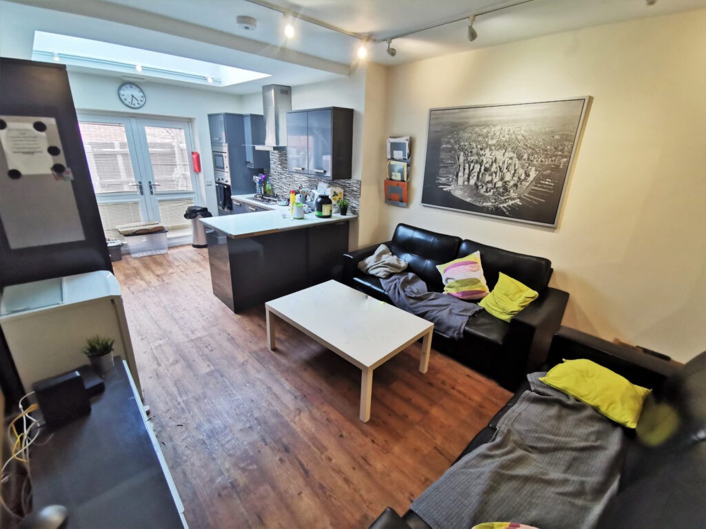 Meanwhile, the property’s open-plan lounge and kitchen area serves as the social hub of the home. Students will find this area furnished with two plush sofas and a wall-mounted TV point, while the adjacent kitchen boasts high-gloss units, a breakfast bar, an integrated oven and hob, and under-counter fridge and freezer units. Overhead sky-lighting additionally floods the space with plenty natural light, ensuring a bright atmosphere for tenants, whilst the kitchen’s rear French doors lead out to a private courtyard, ideal for al fresco relaxation.