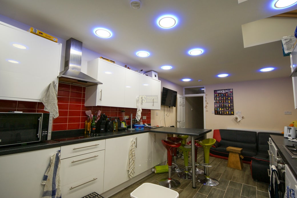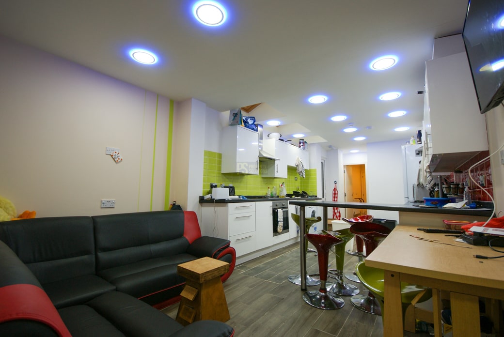 This stunning property features an open-plan lounge and kitchen area fitted with modern furnishings, inclusive of a breakfast bar, a corner sofa, and a television. Here, students will also find the property’s washer/dryer and dishwasher.